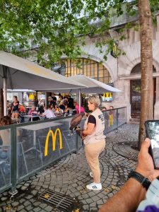 Of course, we didn’t actually go to McDonald’s. Instead we had the local ‘speciality’ of Francesinha. It’s made with layers of toasted bread and assorted hot meats such as roast, steak, wet-cured ham, linguica, or chipolata over which sliced cheese is melted by the ladling of a near-boiling tomato-and-beer sauce called molho de francesinha. It’s probably about a week’s worth of calories. I’m not sure that it is healthier than McDonald’s either.