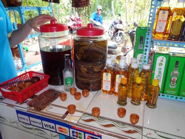 The coconut is very versatile – lots of products from the water, milk, flesh, and shell. We had a shot of spirit of course. See the jar with the spirit infused with snakes – some poisonous. The “three step snake” is named by how far you can go after being bitten.
