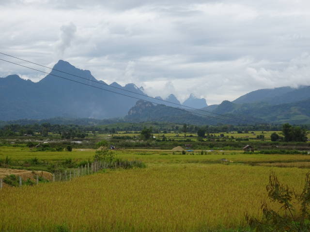 We headed for Ventiane, the capital, with a stop-over in Vang Vieng. This time we travelled by road in a mini-bus and “VIP” small coach. I think VIP stands for Very Irritated Passengers. The roads were really bad and bumpy. Tarmac is a luxury. I don’t know how the Toyota buses manage to take such a hammering. The first leg over the mountains to Vang Vieng took 5 hours for about 190km.