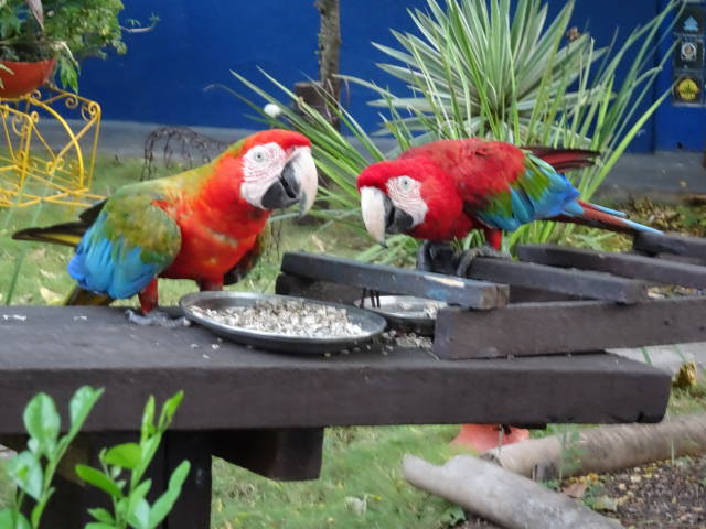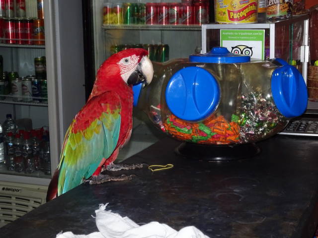 Back at the ranch they have some tame macaws who like sweets. This clever guy could unscrew the lid and help himself.