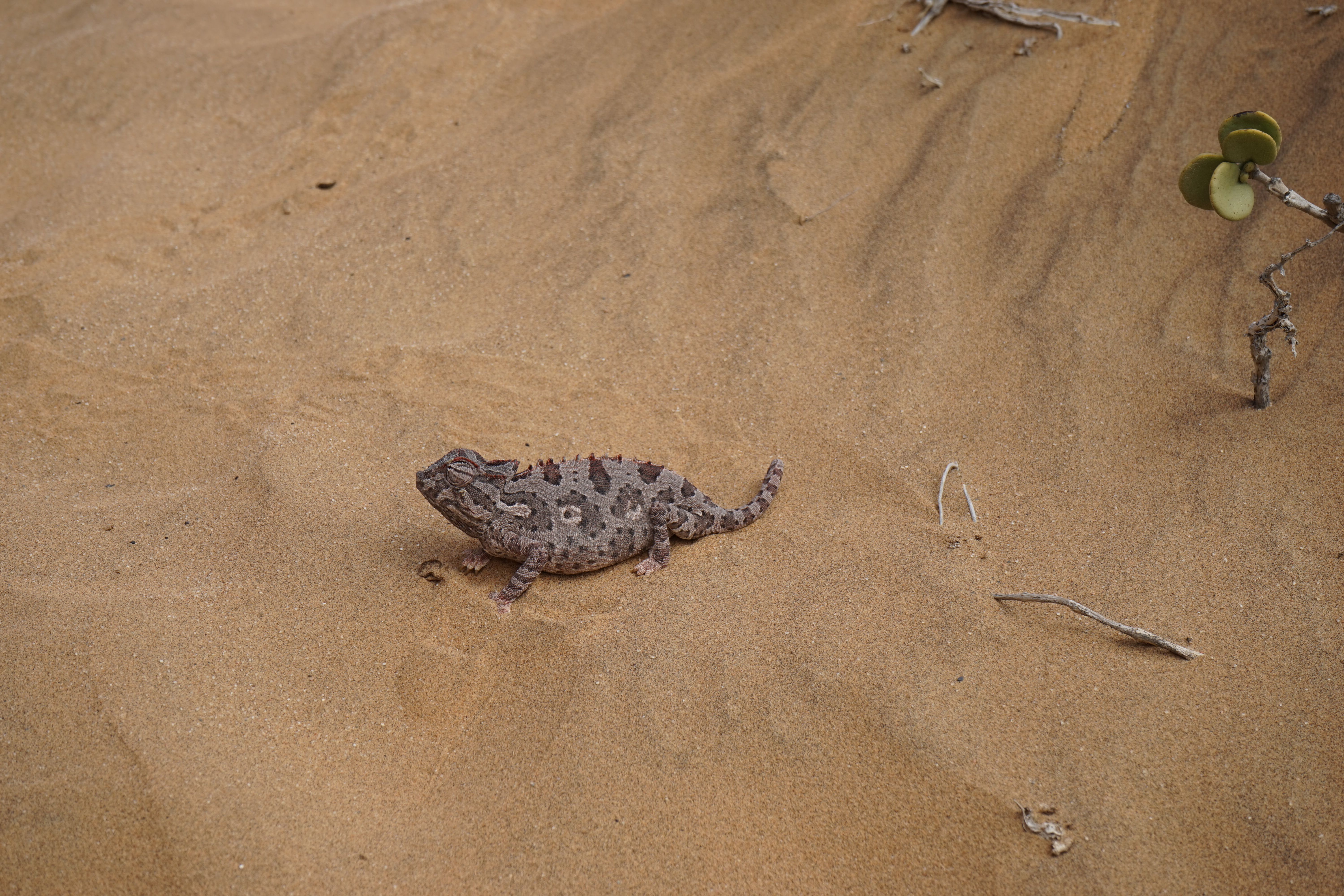 In the afternoon we did a 4×4 “Living Desert” tour to discover the animals that hide and survive in the sand. That’s more than can be said for the railway lines that have been rebuilt twice already after being reclaimed by the dunes. Our guide found a sand-diving lizard who shed his tail when caught. It’s apparently a defensive gesture, but I think I’d rather keep my limbs. It was odd to see the tail still waggling on its own. I don’t think my leg would do that. Apparently the tail regrows though. The guide uncovered a couple of snakes – a sidewinder adder and a horned adder. The guide fed worms to a chameleon he found in a prickly bush and we watched it fire its long tongue out to grab them. After being in the dry desert this long, I reckoned I could do the same with a glass of beer. The guide also explained that the black colour on some areas of sand was magnetite and proved it with a magnet trick. The purple is from garnet.