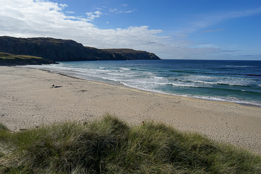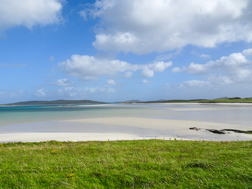We took the ferry from South Harris to the island of Berneray. Berneray is then connected by a causeway to North Uist. That night we stayed at a lovely campsite called Balranald next to a horseshoe-shaped bay of white sand.