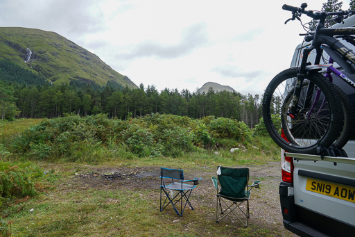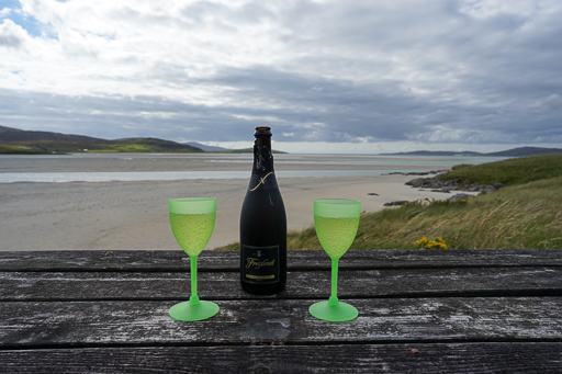 It was our wedding anniversary, so we had some fizz overlooking a beach. There was a wild campsite with an honesty box for donations of £5 towards local maintenance.